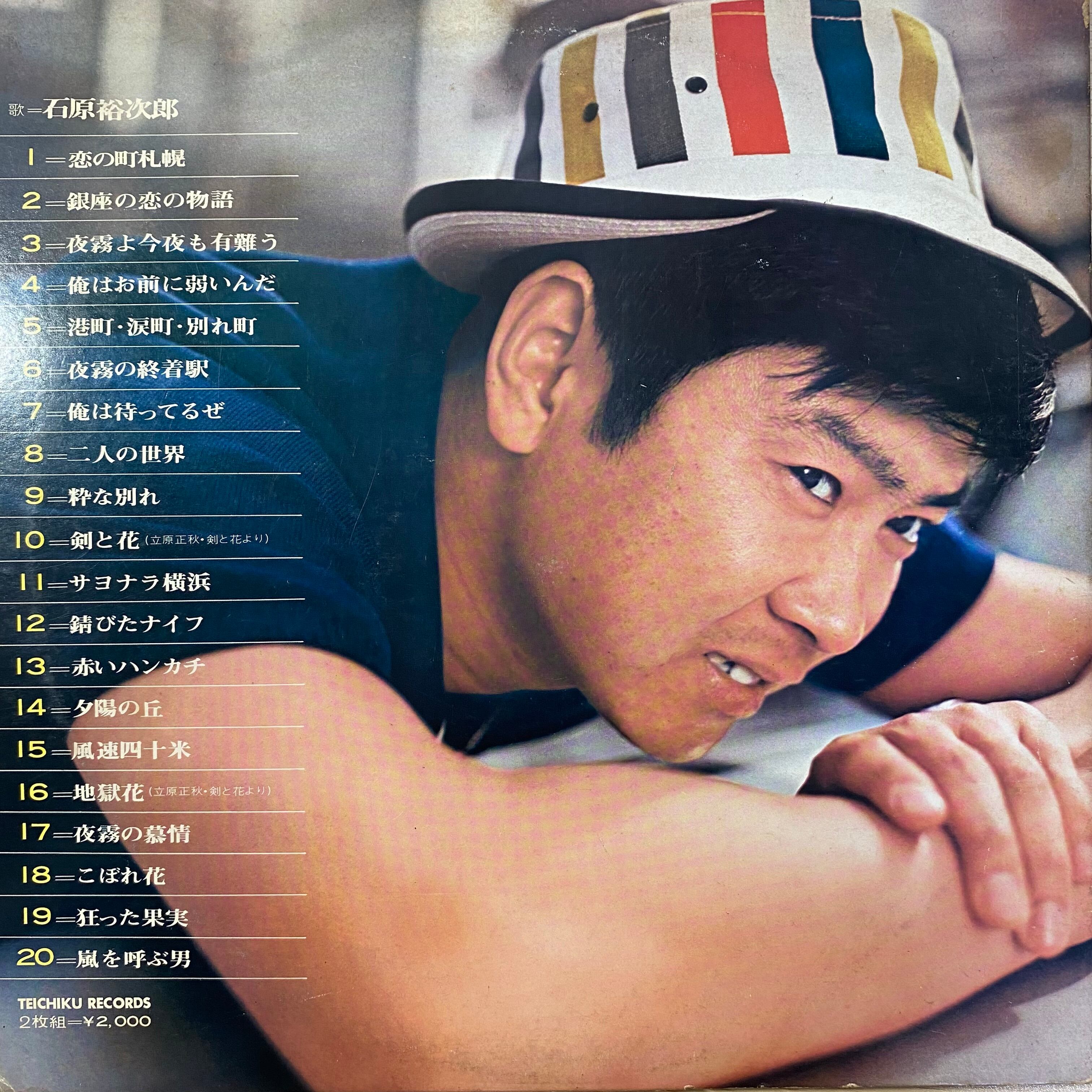 石原裕次郎の代表的なヒット曲20曲を厳選した2枚組ゲートフォールド仕様のLPベストアルバムです。オリジナルは昭和47年(1972年)にテイチクレコードから『BL‑2001~2』の品番でリリースされ、以来コレクターズアイテムとして高い人気を誇っています。収録曲は「恋の町札幌」「銀座の恋の物語」「風速四十米」「嵐を呼ぶ男」など、歌謡曲・演歌ファン必聴の名曲揃いです。