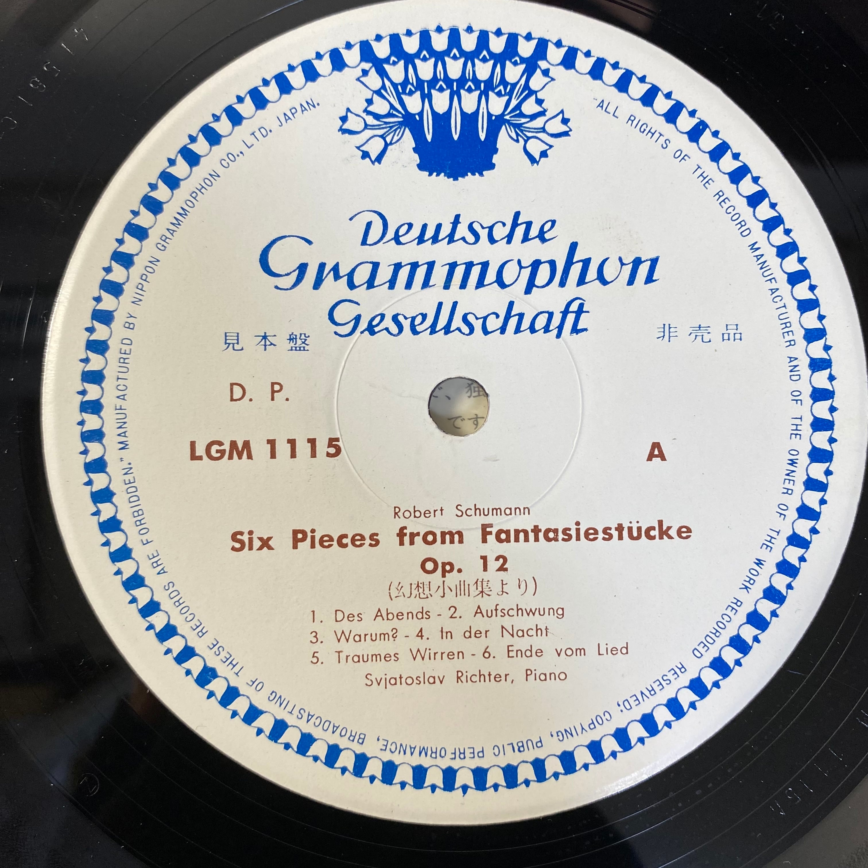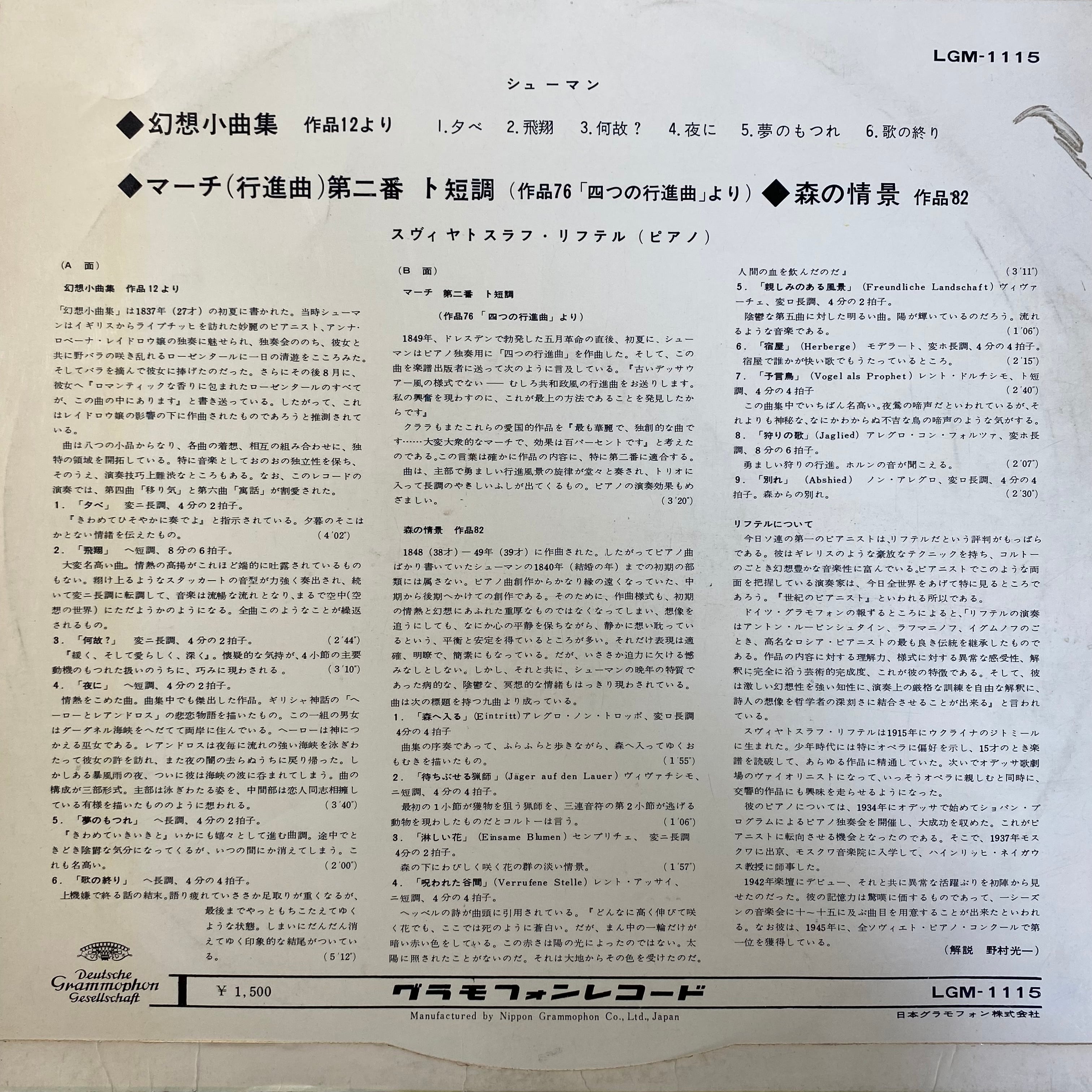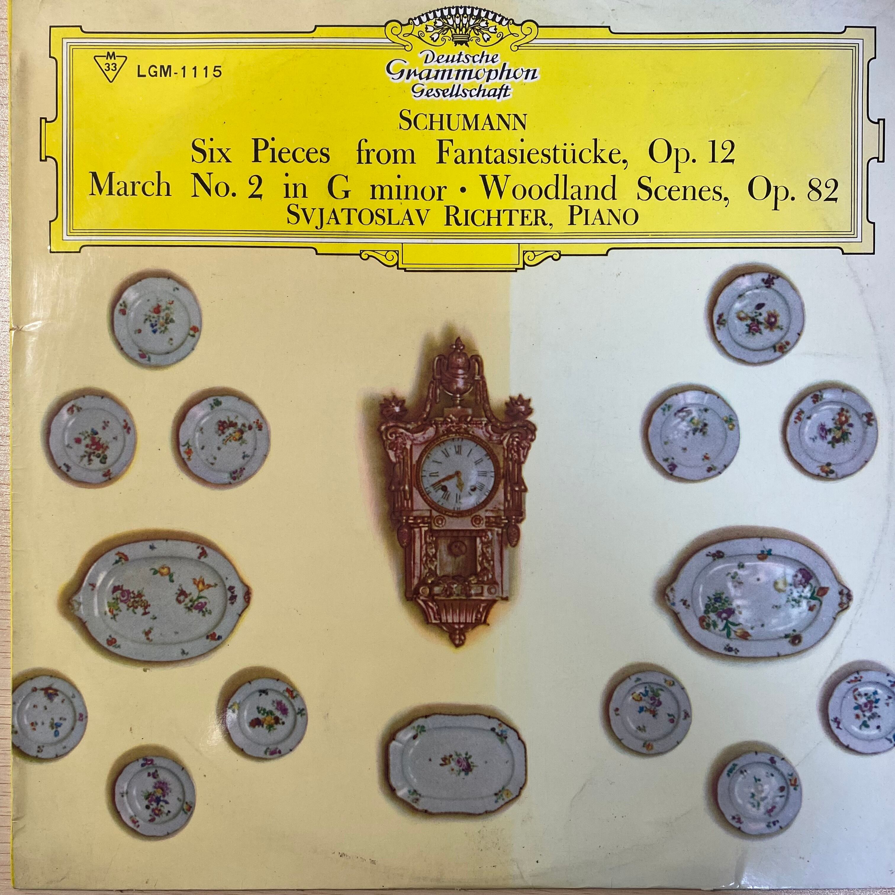 シューマンの代表的ピアノ小品「幻想小曲集 Op. 12」、さらに「マーチ(行進曲)第2番 Op. 76」、そして「森の情景 Op. 82」などを、高名なピアニスト、リヒテルがドイツ・グラモフォンへ録音したLP盤です。