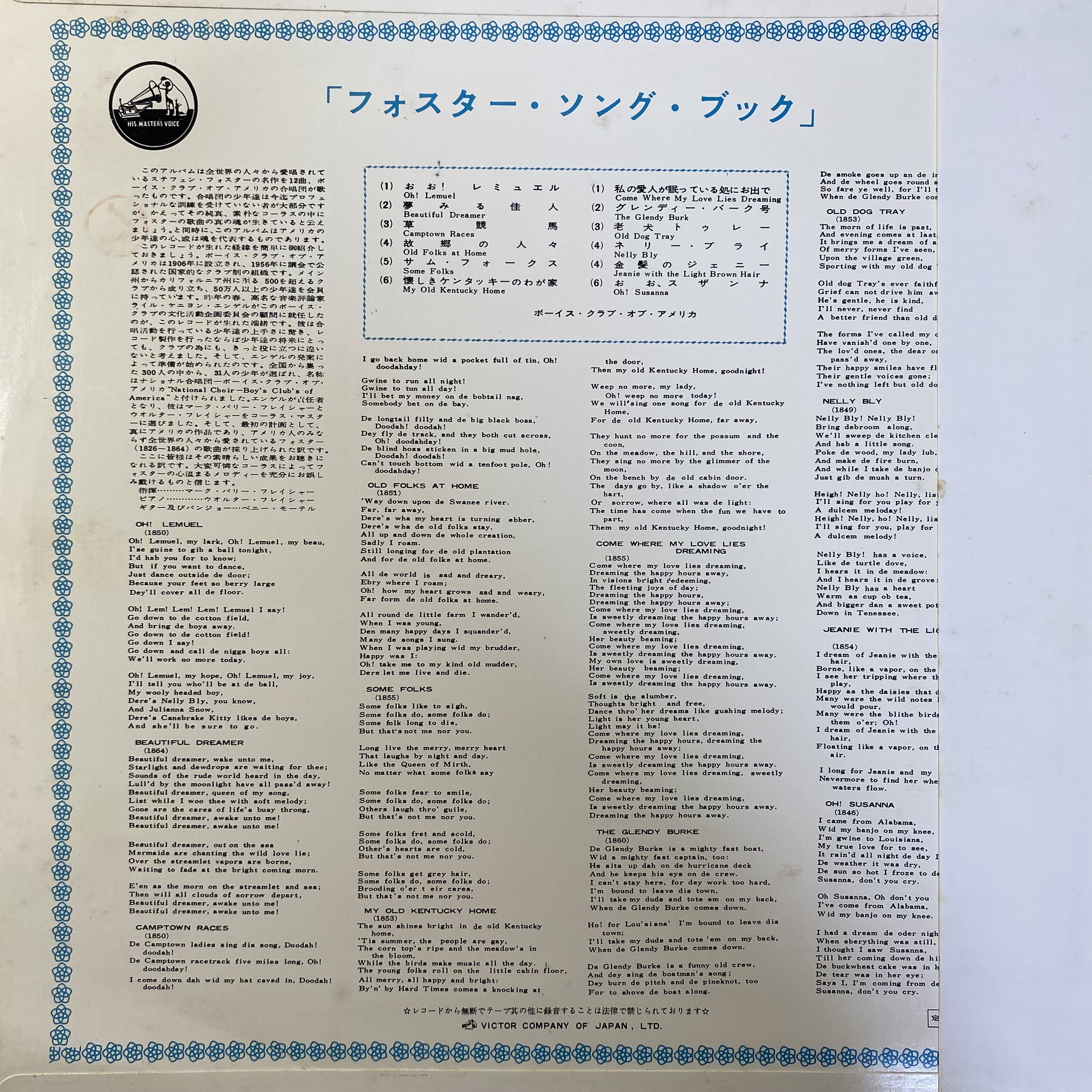 アメリカのボーイ・コーラスによるフォスターの名曲集。心温まるフォスターの歌を楽しめる一枚です。